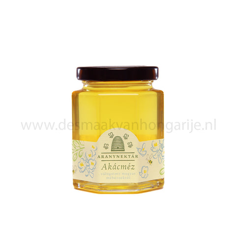 Echte 100% Hongaarse Acaciahoning. Acaciahoning (akácméz) wordt verkregen van de nectar uit de acaciaboom. Vanwege een hogere hoeveelheid fructose blijft de akácméz ook langer vloeibaar dan andere honing. Acaciahoning heeft een lichte kleur en een zachte smaak. Lekker als zoetstof voor in de thee, koffie, yoghurt en op brood. Ook ideaal in bepaalde gerechten en desserts, daar de zachte smaak van acaciahoning niet sterk zal overheersen. Aranynektár begon als kleine imkerij in 1929 en levert sindsdien al ruim vier generaties lang biologische honing van uitstekende kwaliteit.